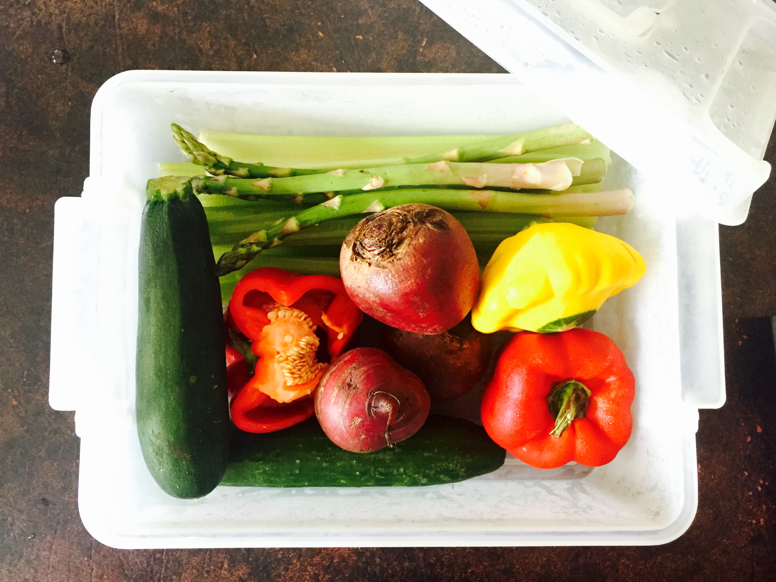 Then it’s just a matter of pulling all your foodstuffs out of the fridge. A little bit of organisation will take you a long way here: to put it simply, I try to keep everything together so I don’t have to make multiple trips. (Again, time-saving. Yes okay, as well as lazy…) The veggie crisper/drawer/bin (whatever you like to call it) is good for that. Who knows… maybe it was even designed with this in mind? 😉